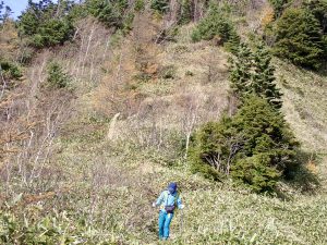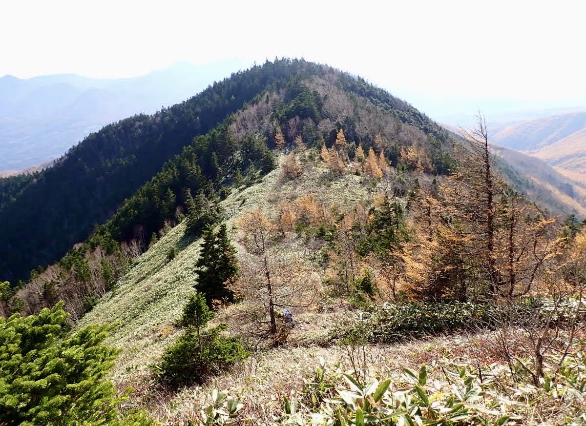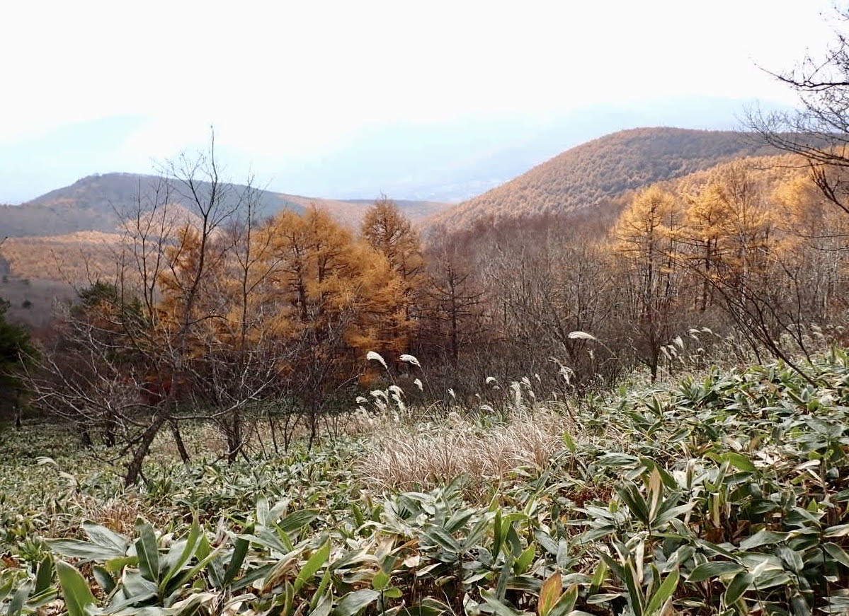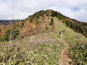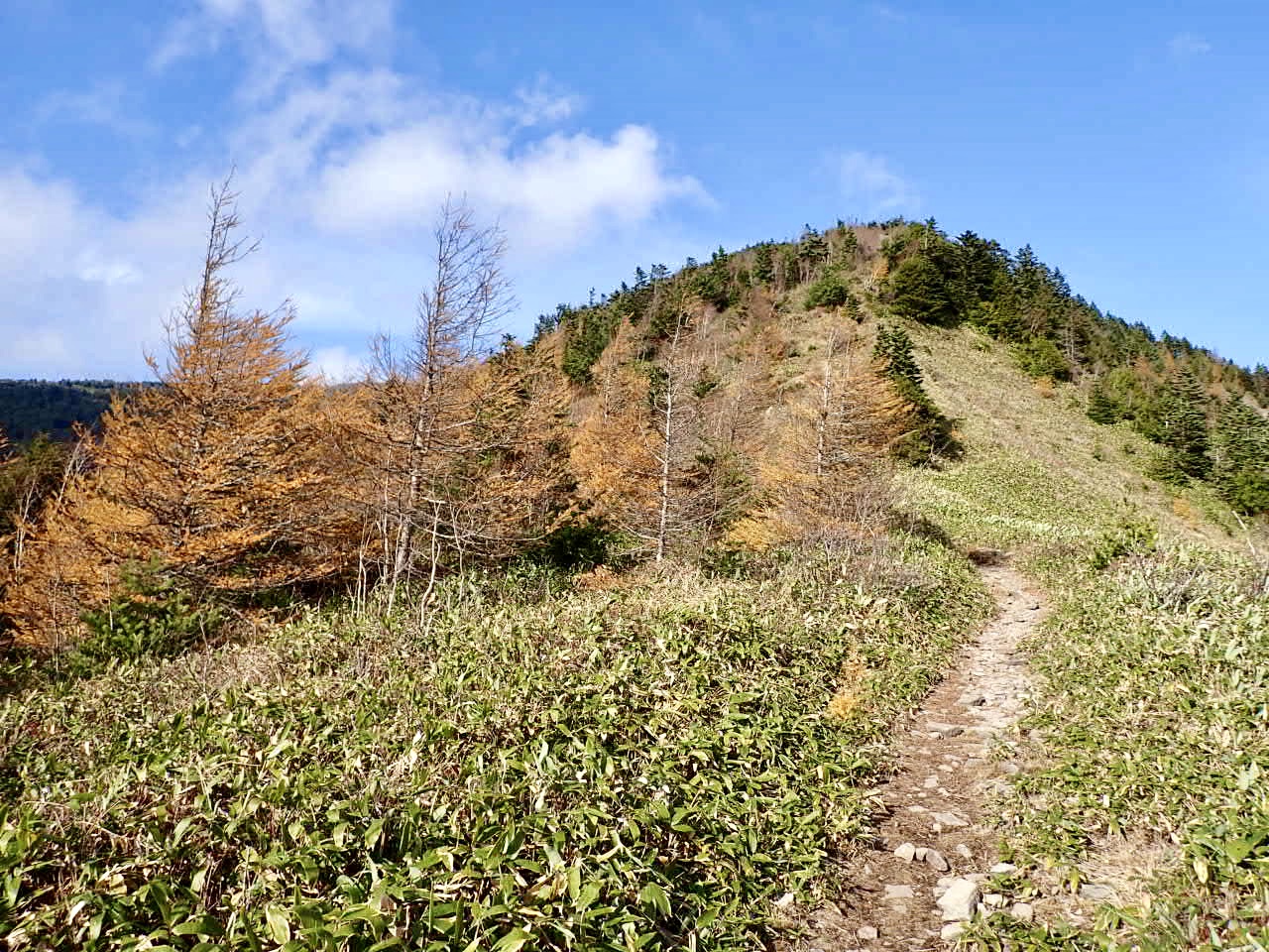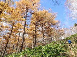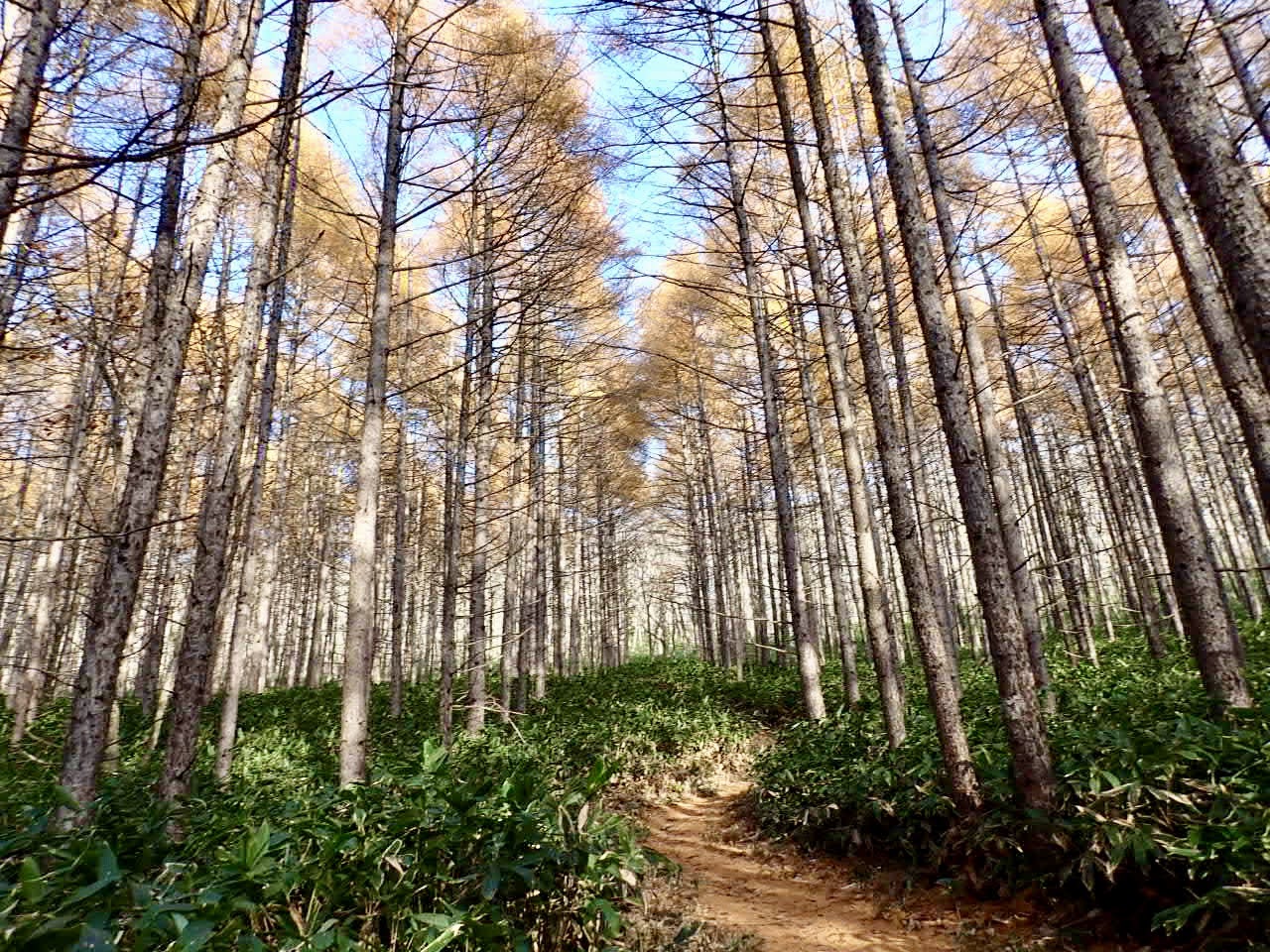 最後はカラマツ林を緩やかに降って登山口にもどった。