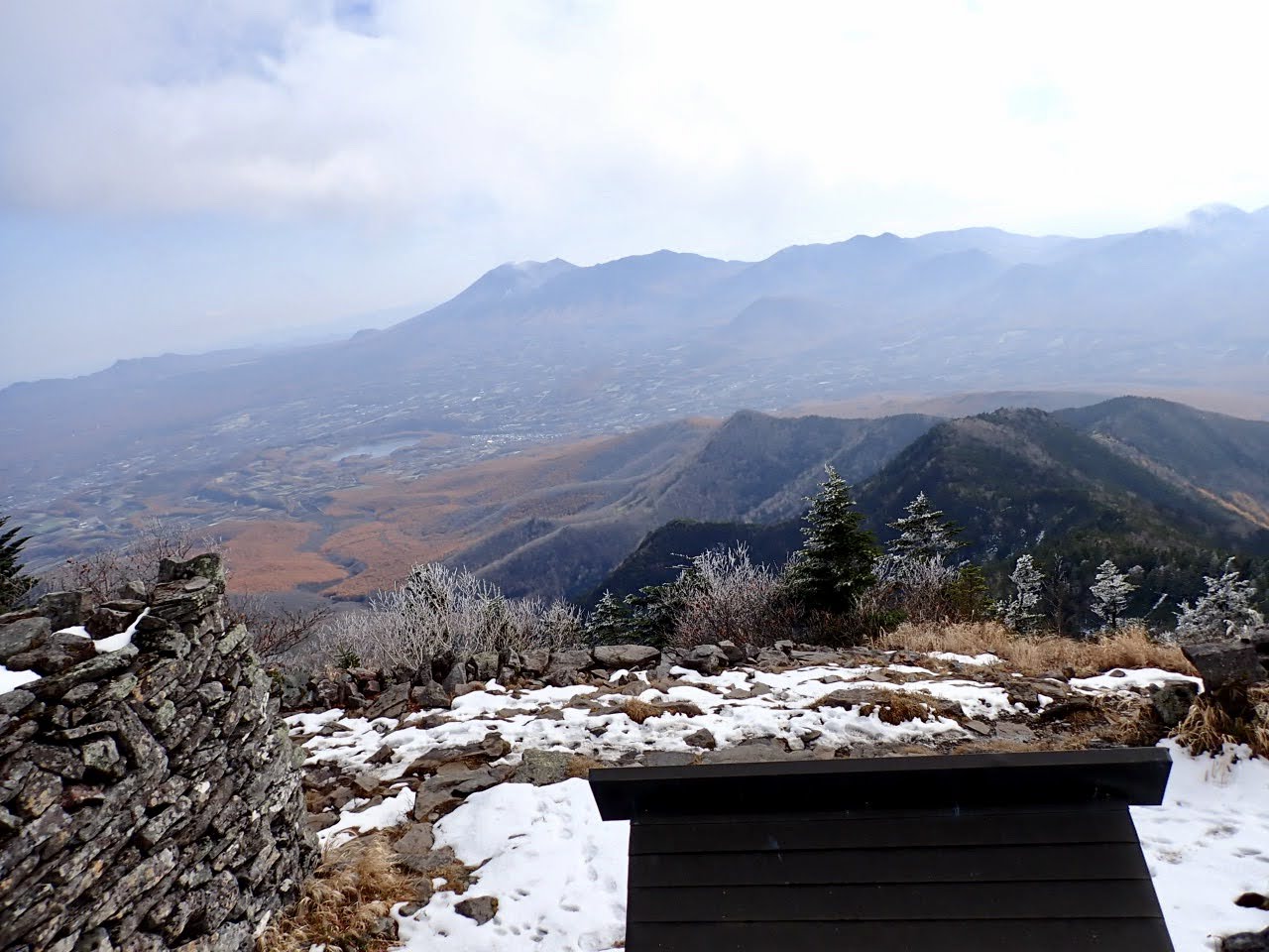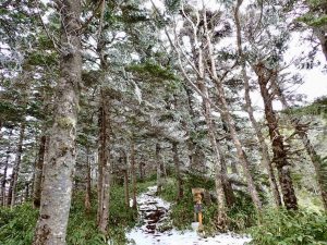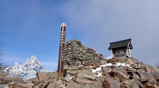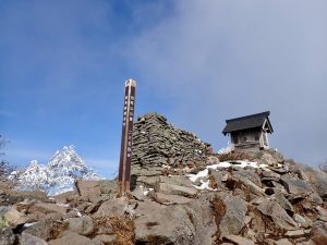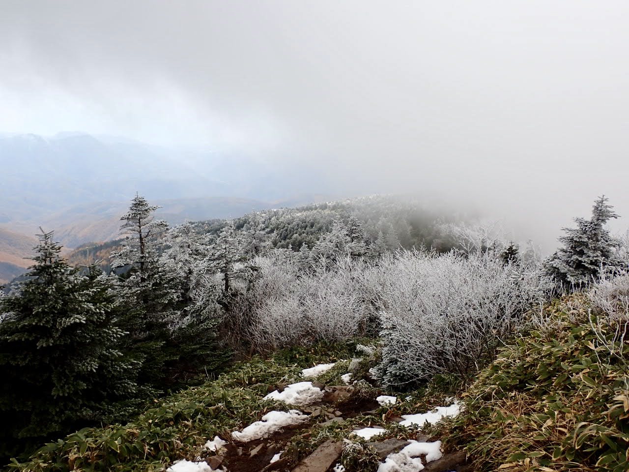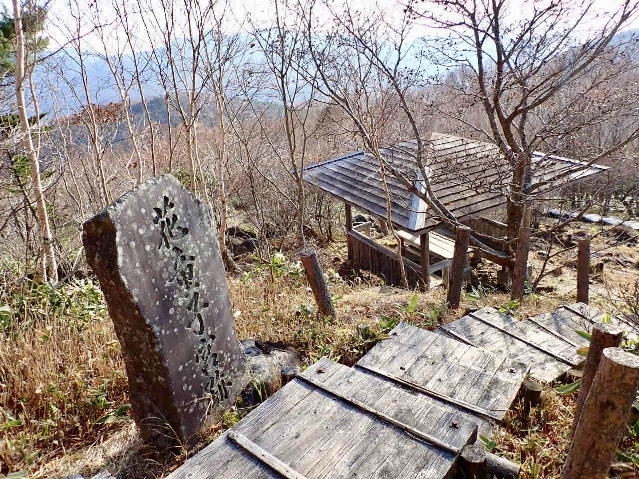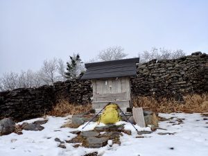 カラマツ林からコメツガ林に変わると雪がつき始める。空模様も怪しくなりガスで視界もとぎれとぎれとなる。登る前は途中まででもいいといいながら山頂が近づくとスイッチが入ってしまい、どんどん登る。すると仲間が自分はもう登らないという。少しの距離のピストンなので待っててもらい一人で山頂へ。最初の祠からは浅間山方面の展望が良かったが、奥の祠に行くとガスが流れたり青空が出たりと目まぐるしい。後で知ったが、上州祠と信州祠というらしい。