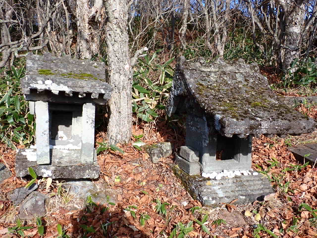 古道分岐の東屋にもどって一安心。パンとコーヒーで一服し、上州古道を下る。所々に小さな石祠があり、古の雰囲気が感じられる。花童子の宮跡という興味をそそる史跡で足をとめる。ものの本によれば花童子【ゲドウジ】とは長野県上田市に伝わる話で、四阿山に降雨祈願をしに行くと、花童子という小童がこつぜんと出現し、これが出ると、必ず雨が降ったという。宮跡は、花童子行者の徳行をたたえ祀られたもので修験信仰の宮跡として市区町村指定史跡とのこと。(以上はすべて浅い後知恵情報)