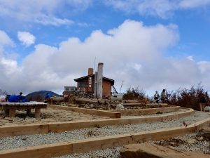 時間かかってもいいので、歩き通すことが大事だと自分にも言いきかせて山頂へ。山頂はきれいに整備され、グズグズだった段々ベンチも一新され快適になっていた。富士山は雲の中だったけど、そんなのどうでもいいこと。