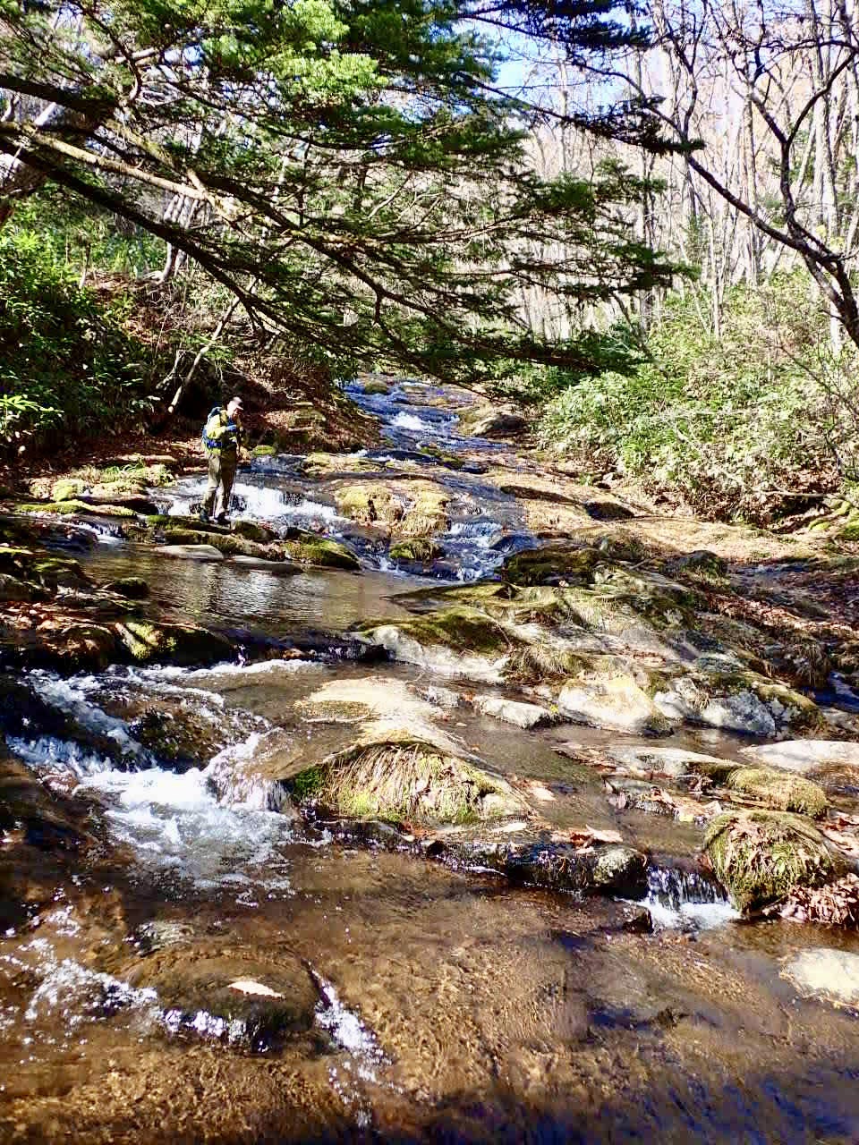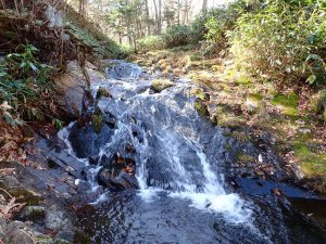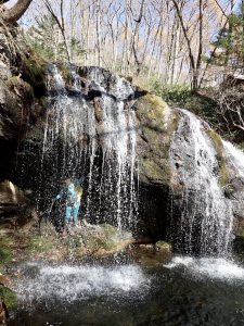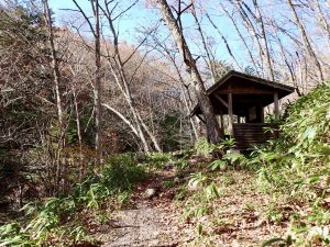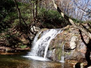 宇田沢の源流付近にある石樋というところで、東屋がありちょっとした滝もある。地元では夏に子どもたちの遊び場になっているという。東屋から滝下におりてみると滝の一部が裏見の滝状態になっている。滝の裏に回り込んだりしてたわいのない水遊びに興じる。