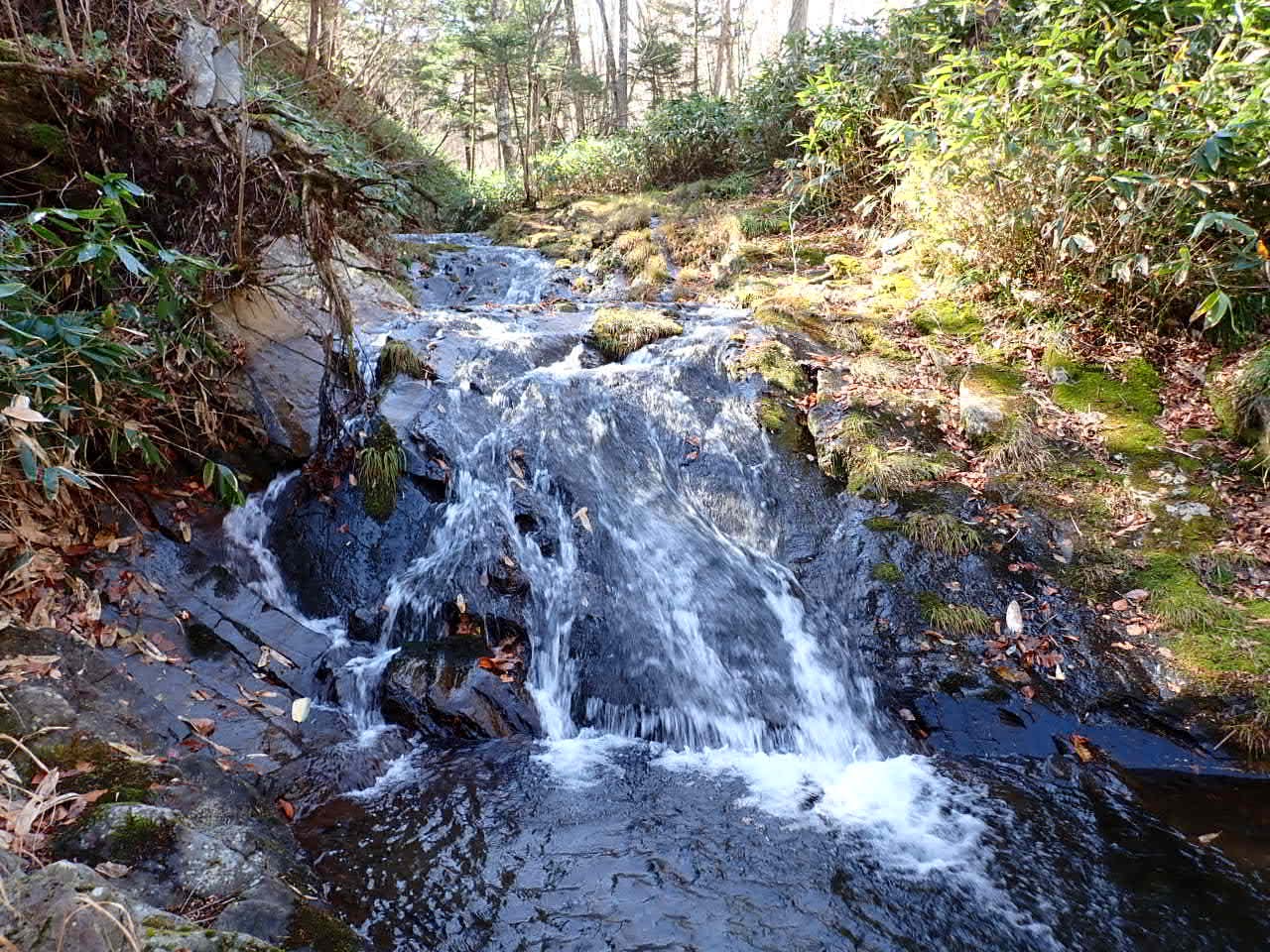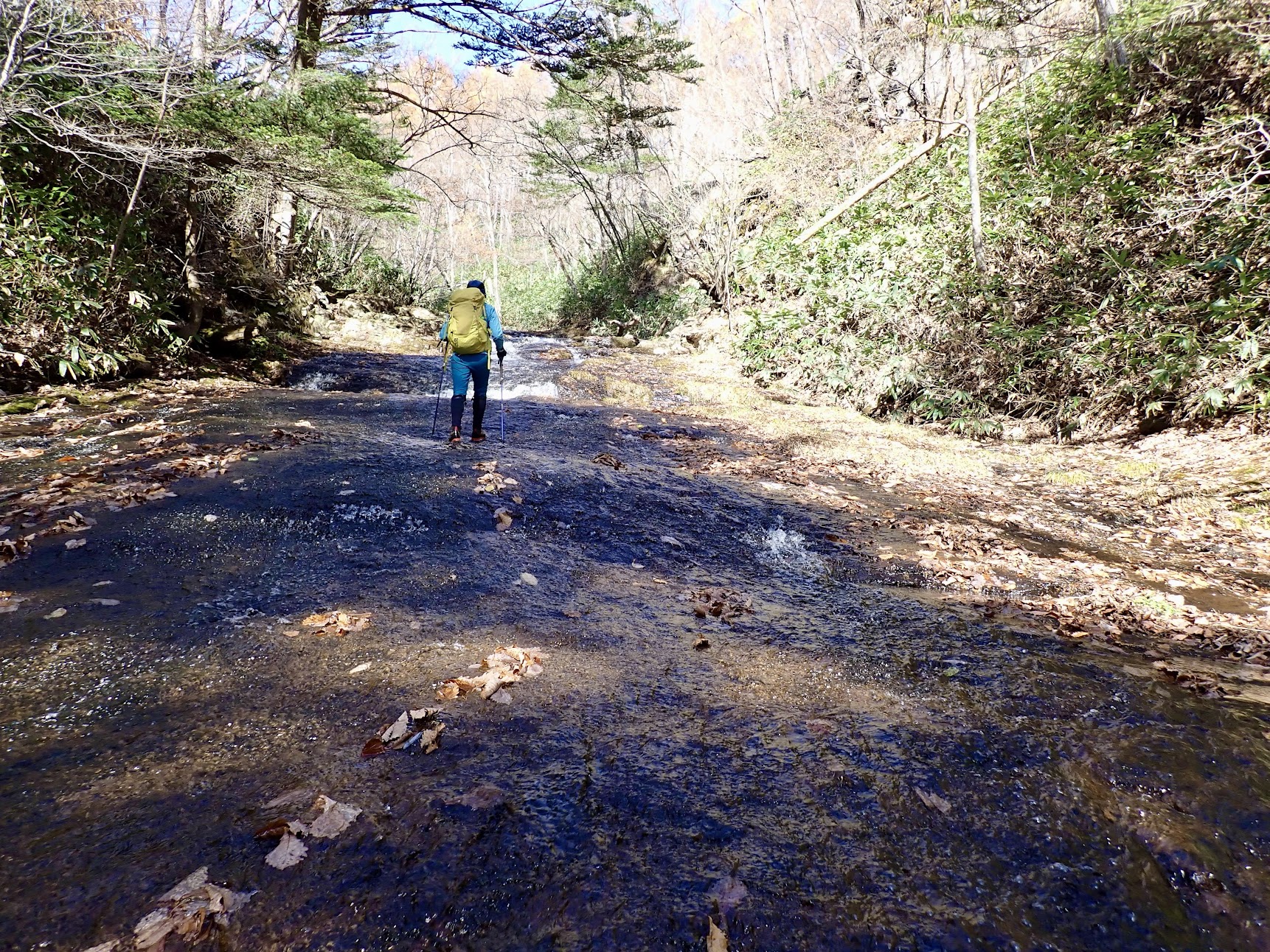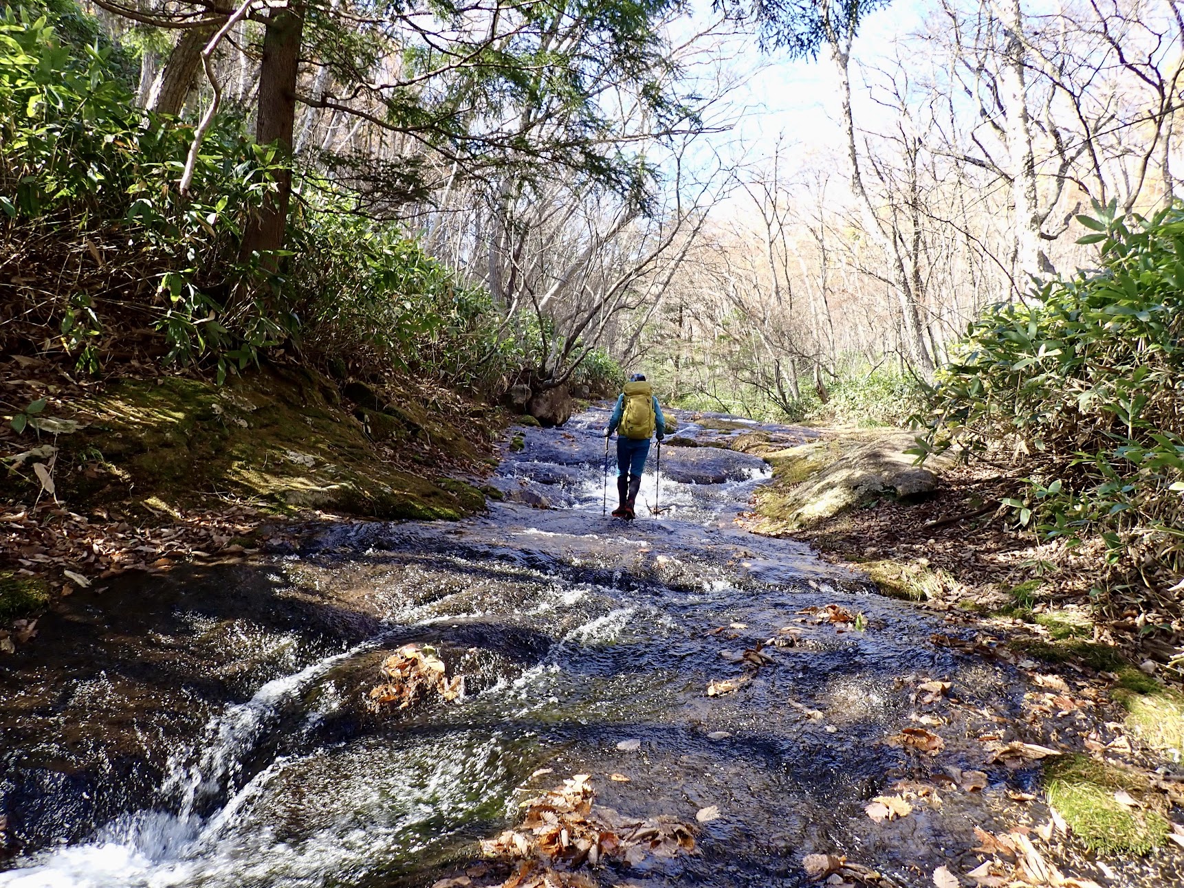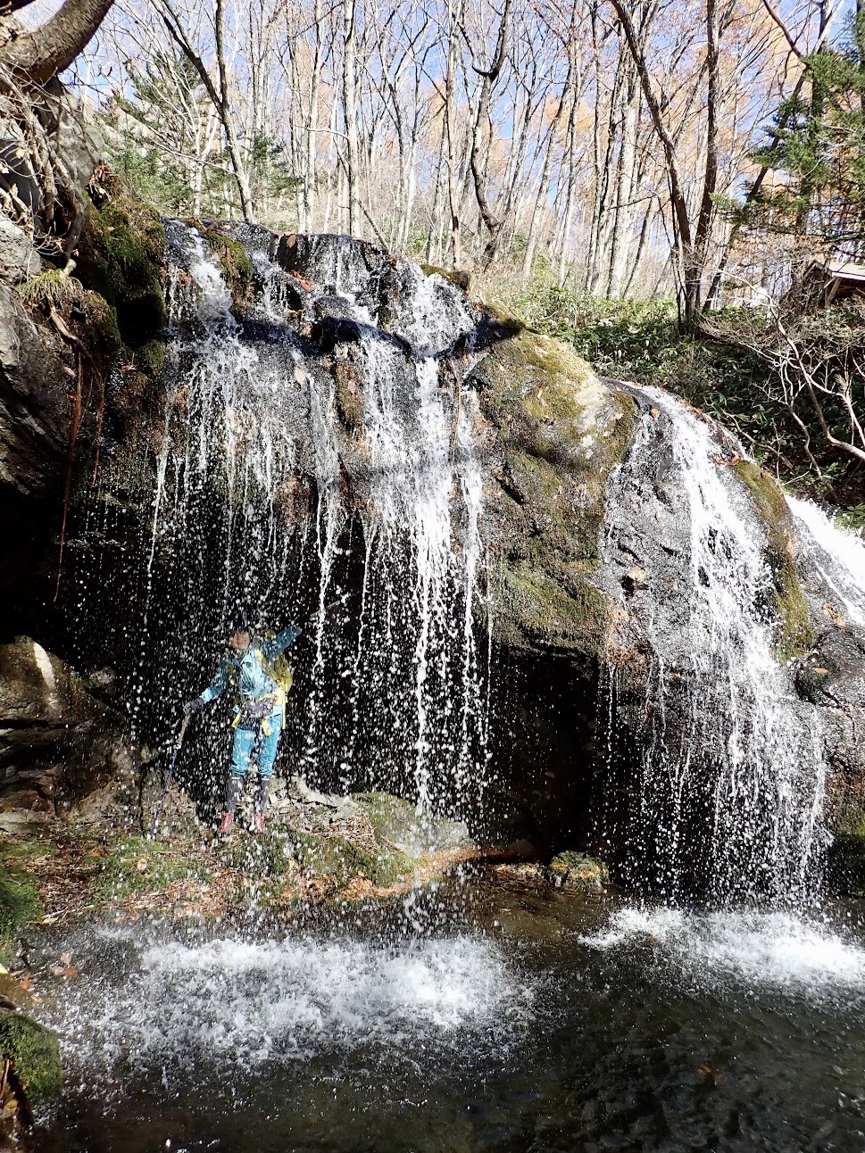 滝上からは突然のように沢幅いっぱいのナメがつづく。予想以上にきれいなナメが何百メートルか続いている。標高が1500mほどと高いので冬枯れ模様ではあるが、陽の光のおかげで寒くもなく楽しい沢歩き。