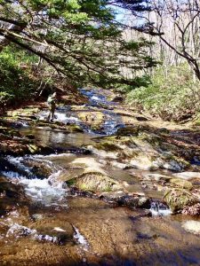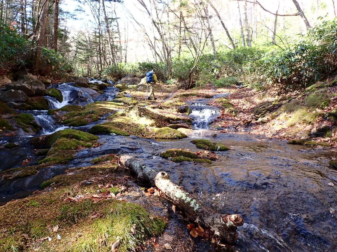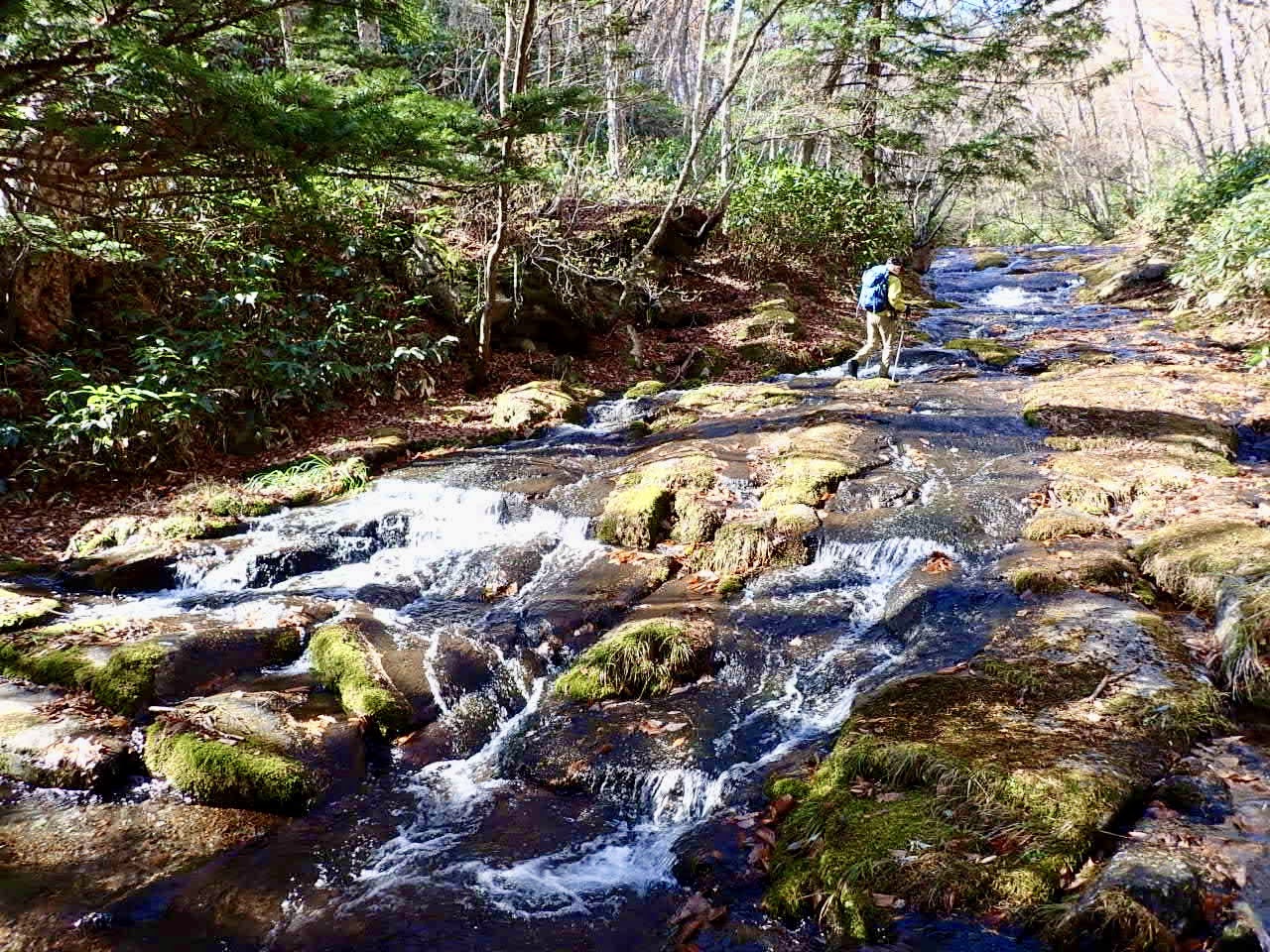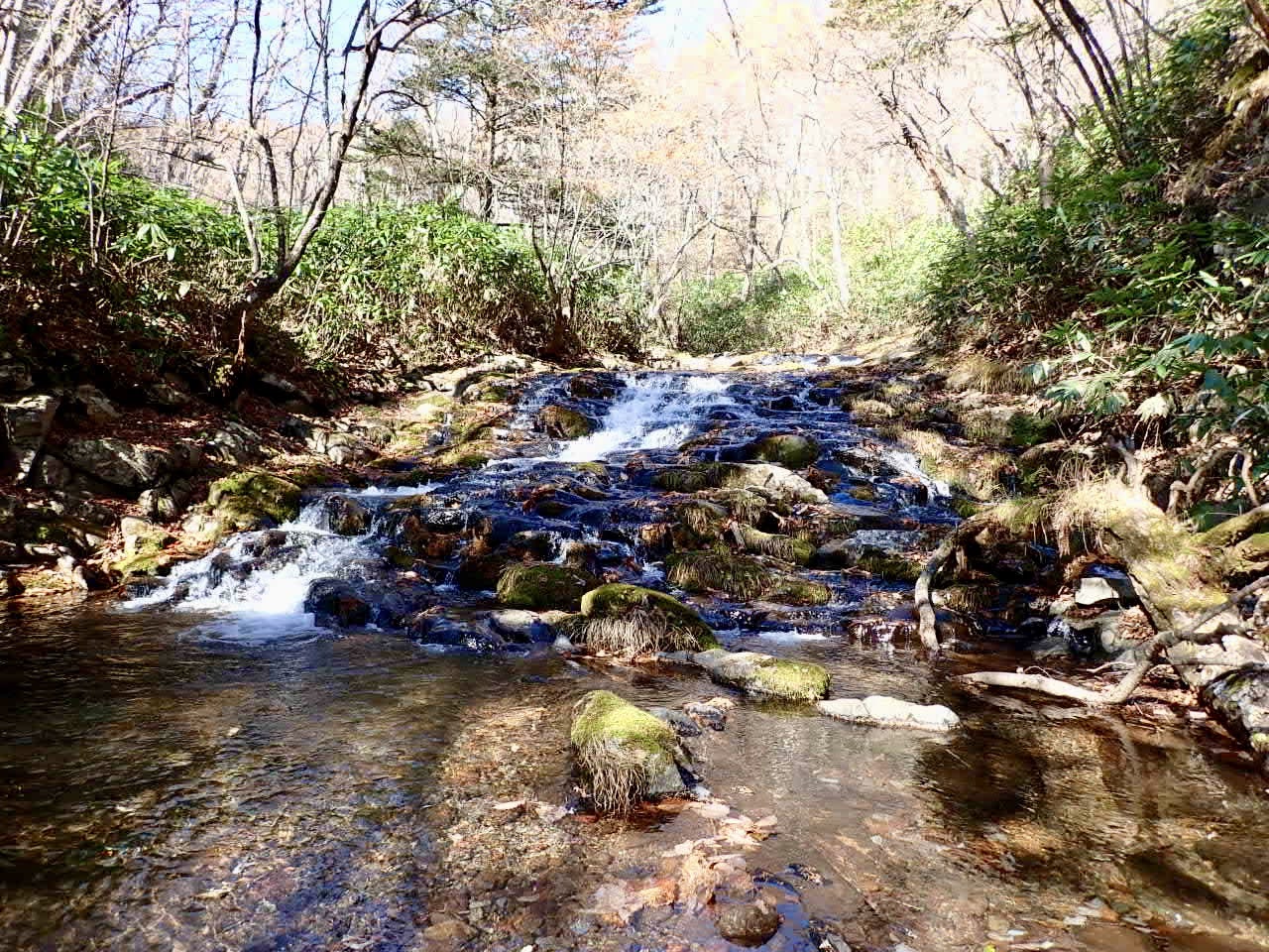 滝上からは突然のように沢幅いっぱいのナメがつづく。予想以上にきれいなナメが何百メートルか続いている。標高が1500mほどと高いので冬枯れ模様ではあるが、陽の光のおかげで寒くもなく楽しい沢歩き。