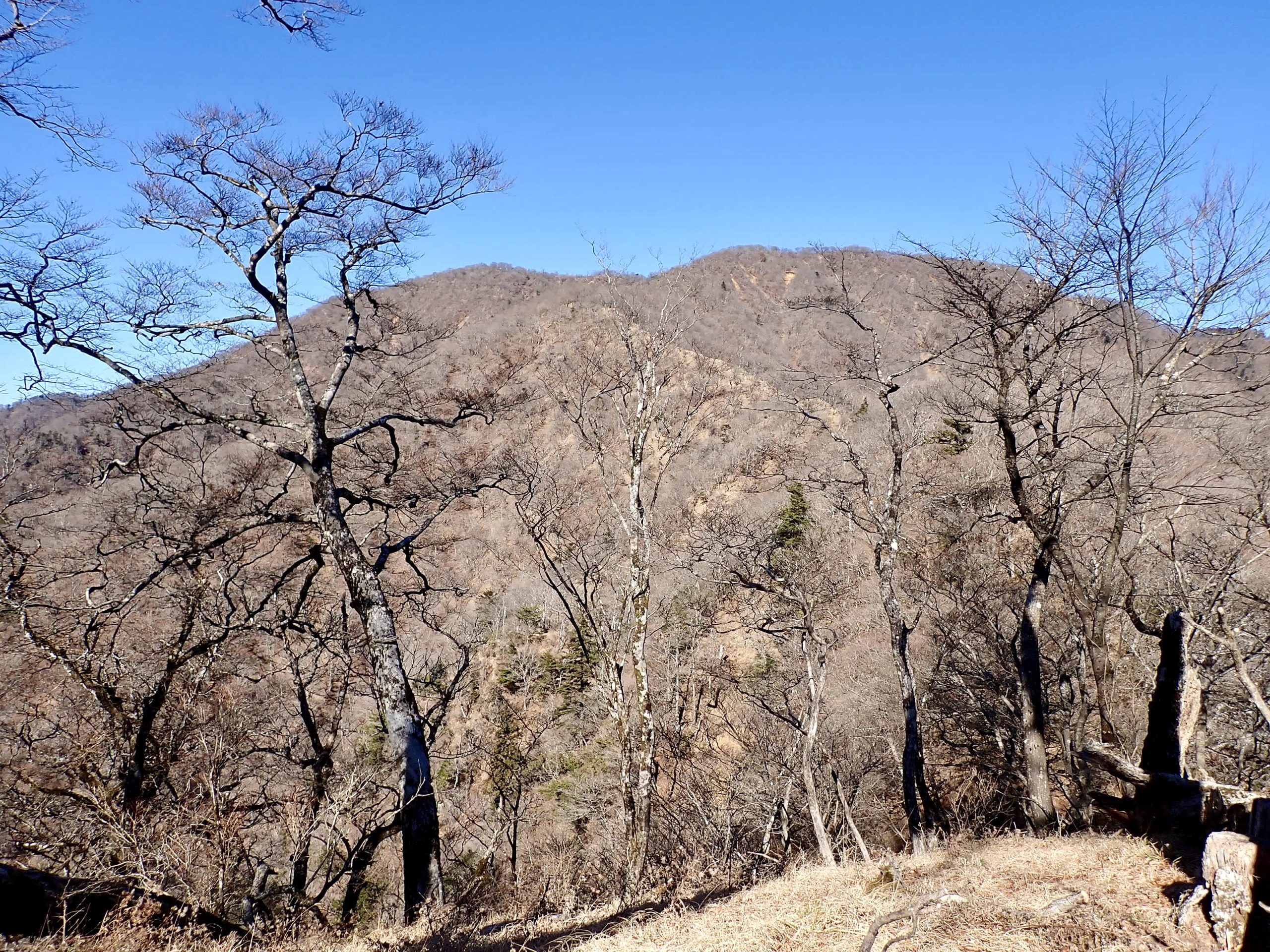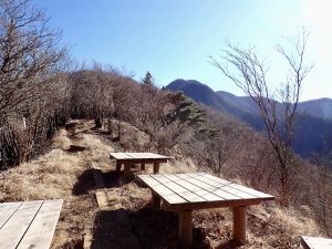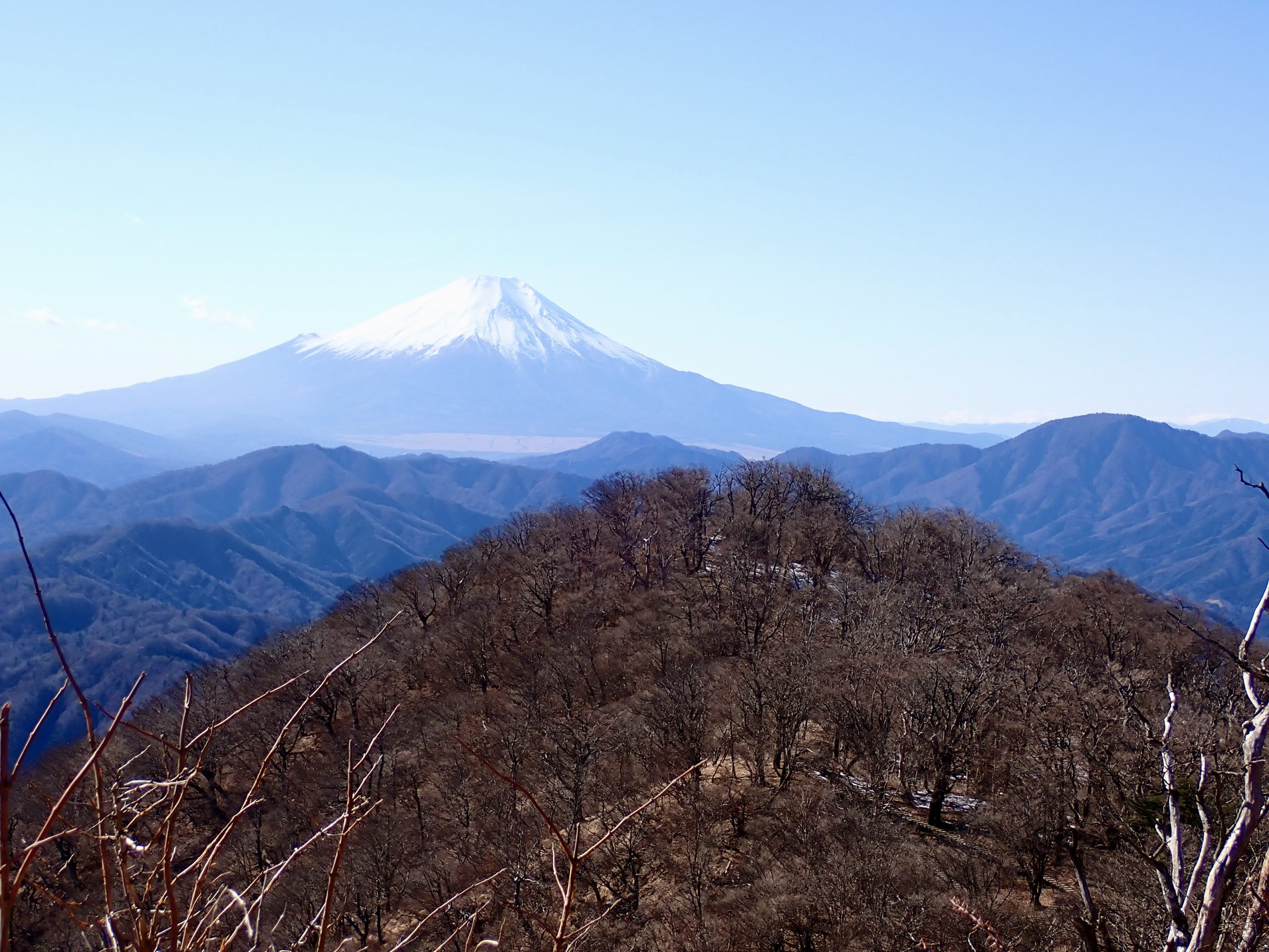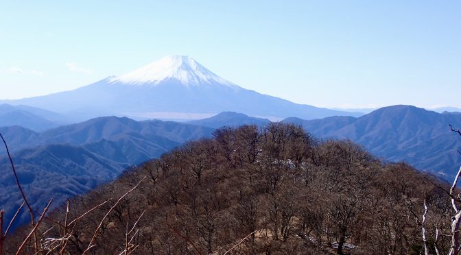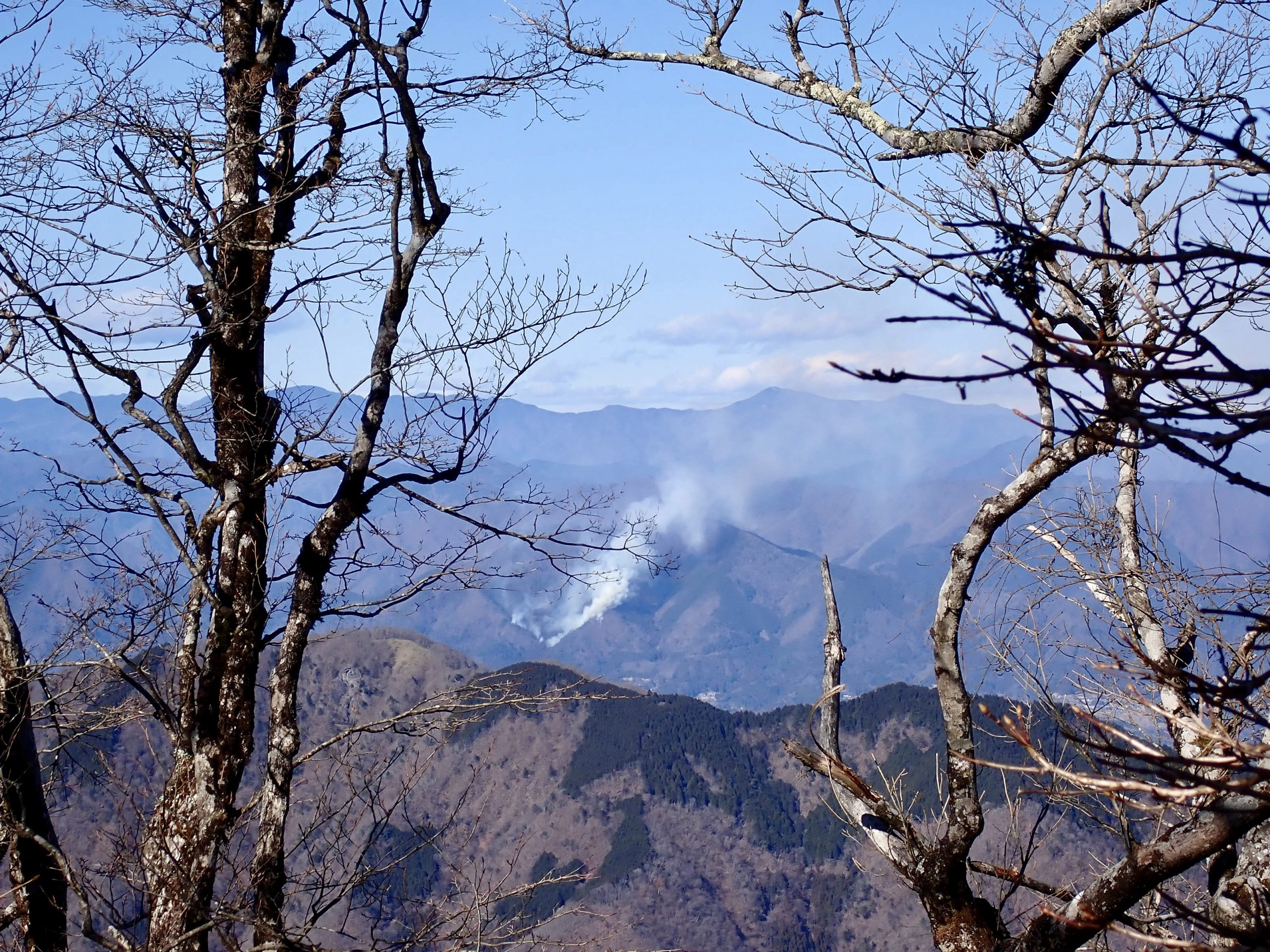 天気は申し分なく、随所で富士山の姿を眺めることができた。加入道山へ向かう尾根を進むと北側の山並みに煙が立ち込めているのが見えた。1月8日に発生した扇山の山火事はいまだ鎮火の気配なく燃え続けているという。12月初旬に登った山なので気がかりだ。