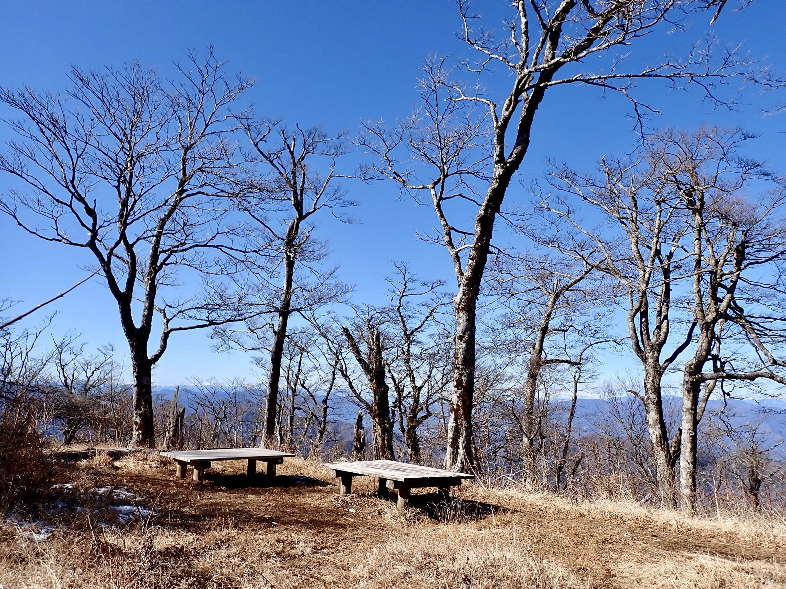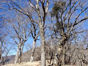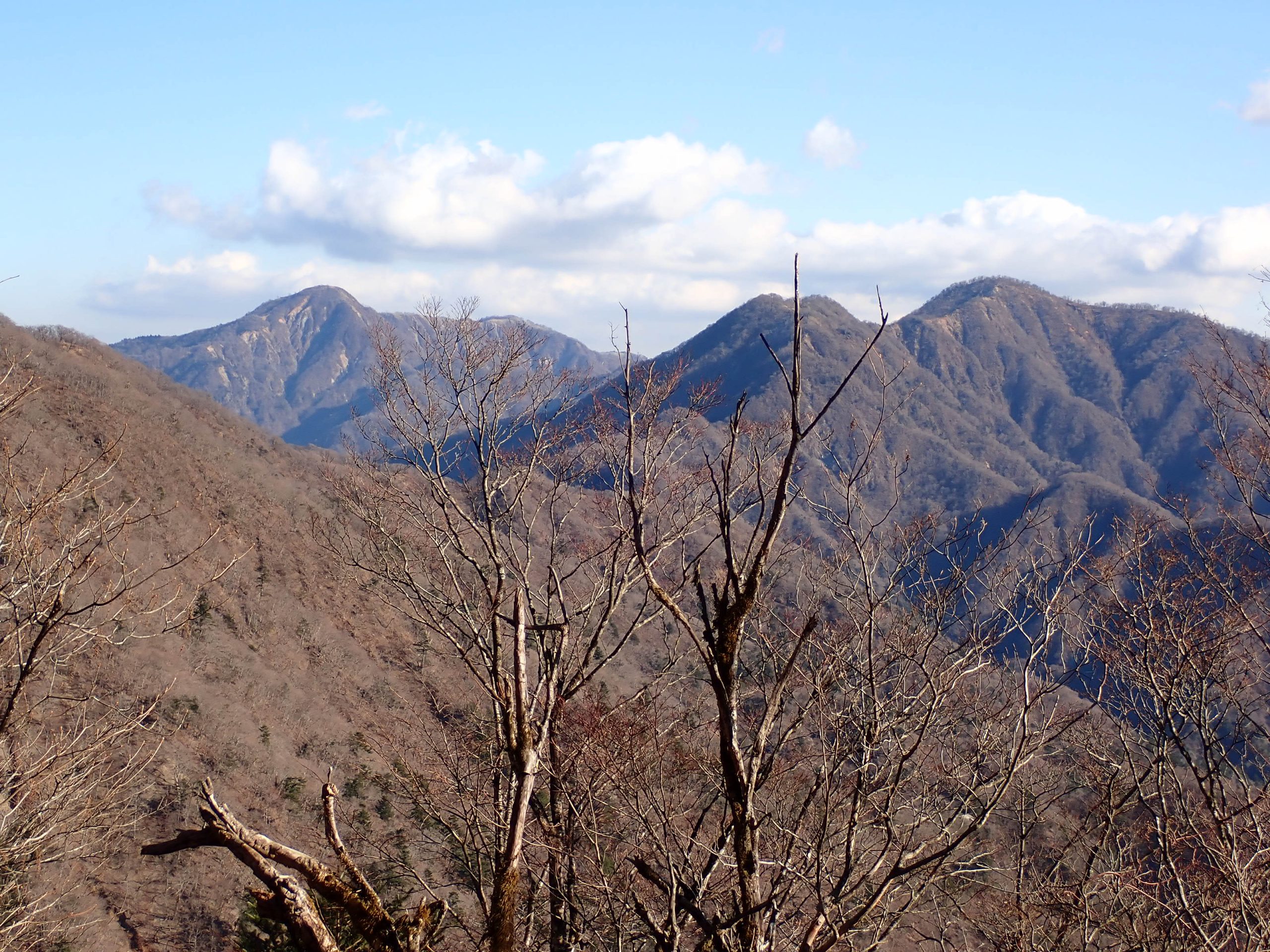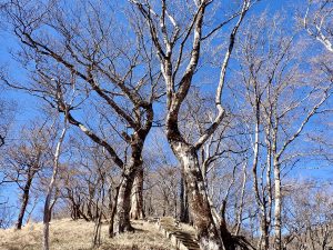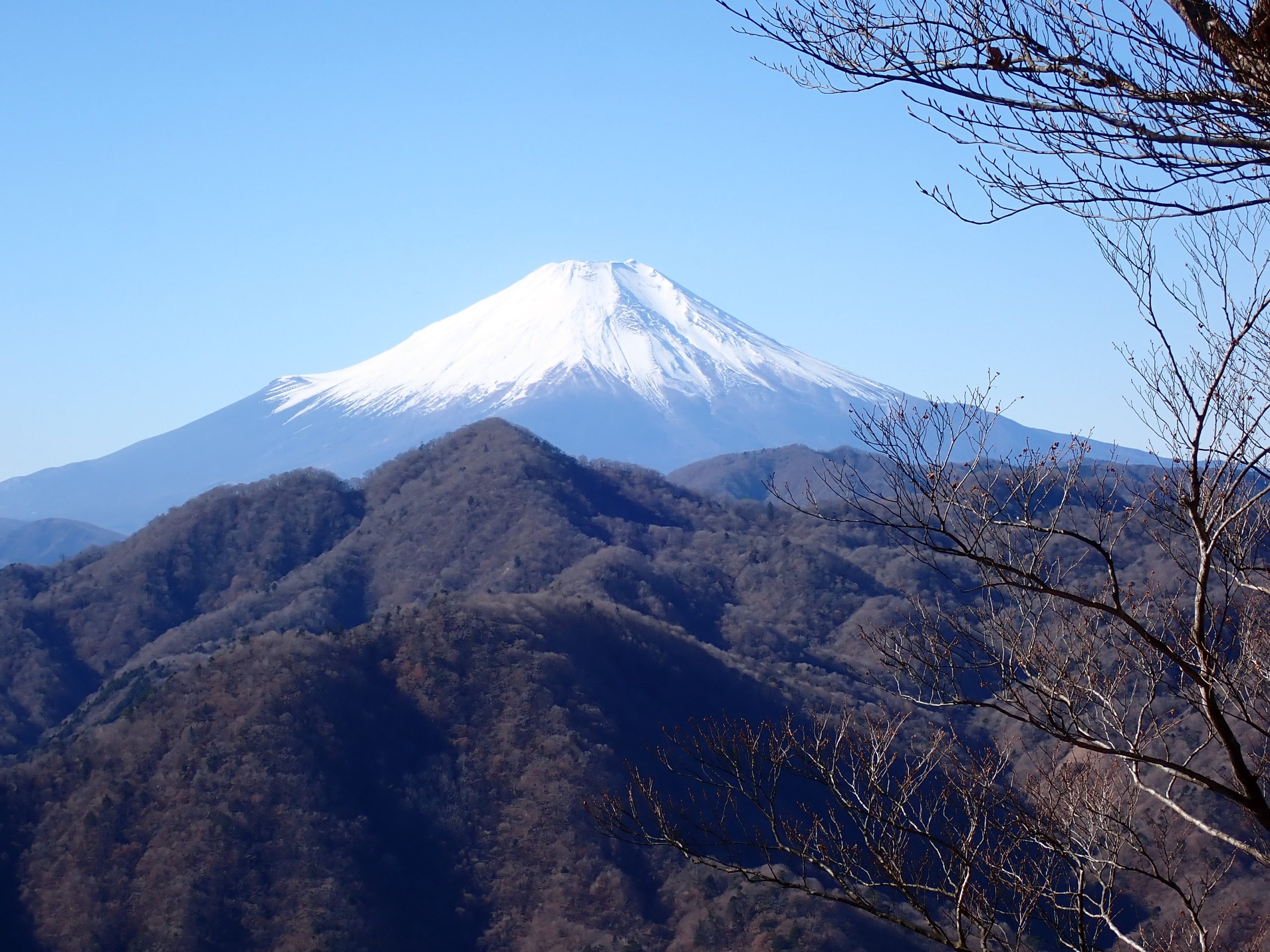 天気は申し分なく、随所で富士山の姿を眺めることができた。加入道山へ向かう尾根を進むと北側の山並みに煙が立ち込めているのが見えた。1月8日に発生した扇山の山火事はいまだ鎮火の気配なく燃え続けているという。12月初旬に登った山なので気がかりだ。